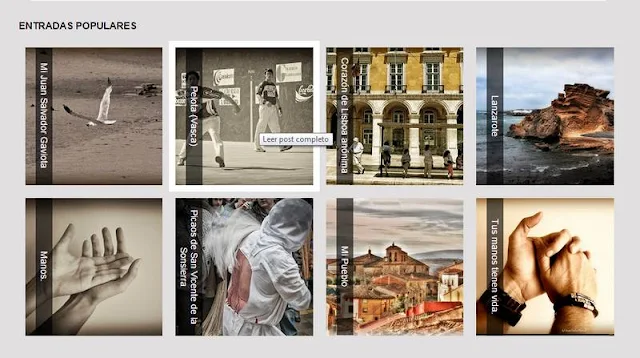 ResponderEliminarPor cierto lo he probado en mi blog de pruebas, y los títulos no me salen sobre cada foto, si no encima de todas ellas y amontonadas unas sobre otras justo donde debería poner "Entradas Populares"... A que es debido??? Me gustaría ponerlas en vertical, cada titulo de entrada sobre cada foto, como en la muestra que nos has dejado y que es lo lógico. :( Y otra cosa, no me salen dos filas de a cuatro (25%), solo me salen 5 fotos en linea de post populares cuando yo tengo puesto en el gadget 8 post. Incluso he reducido ese tamaño al 15% por si eran demasiado grandes para el ancho de mi blog y no ha servido de nada. Espero me indiques y perdona por ser tan plasta, pero me gusta mucho este gadget así y me encantaría poder usarlo¡¡ :)